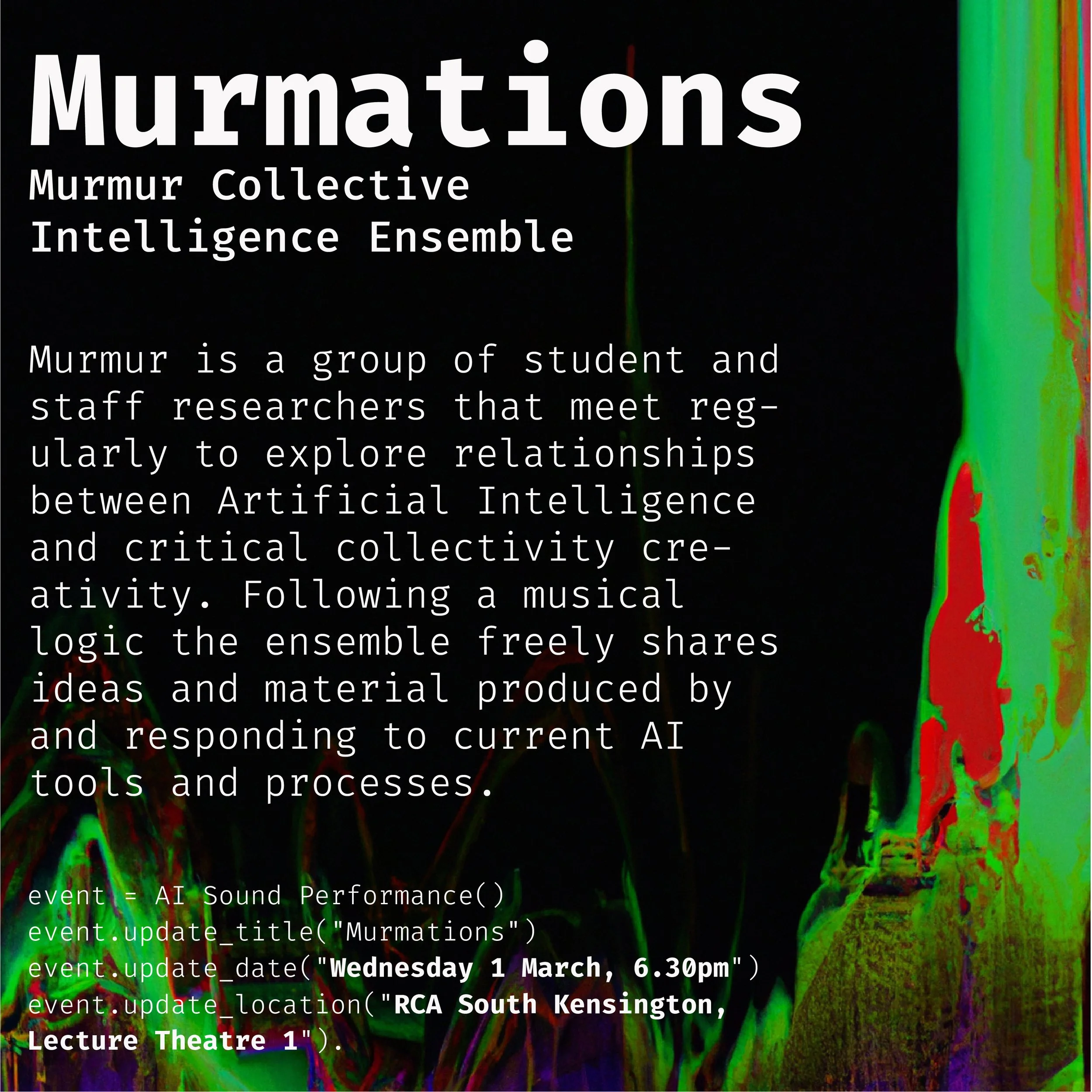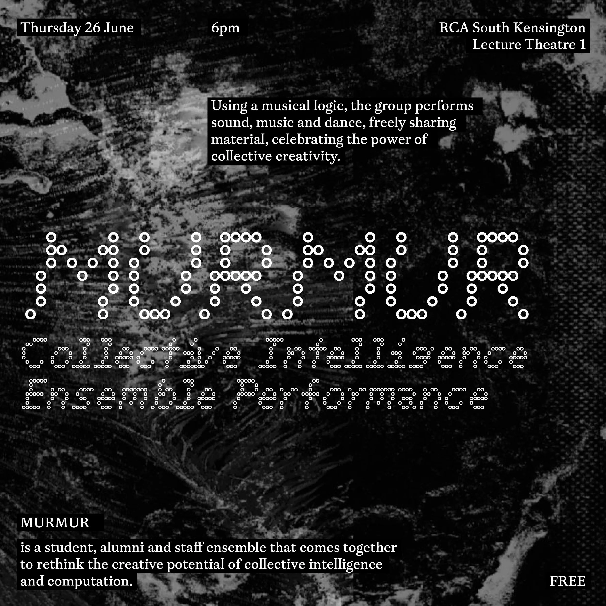 Murmur is a Collective Intelligence Ensemble led by Matt Lewis, Murmur shuns the idea of the lone creative genius and instead is a platform for exploring collective creativity. Murmur also runs at the RCA and is made up of staff, students and alumni from the RCA, using a music workshop model we meet regularly to explore the potential of collective and community computation. We perform regularly at the RCA and at other venues including Iklectik.